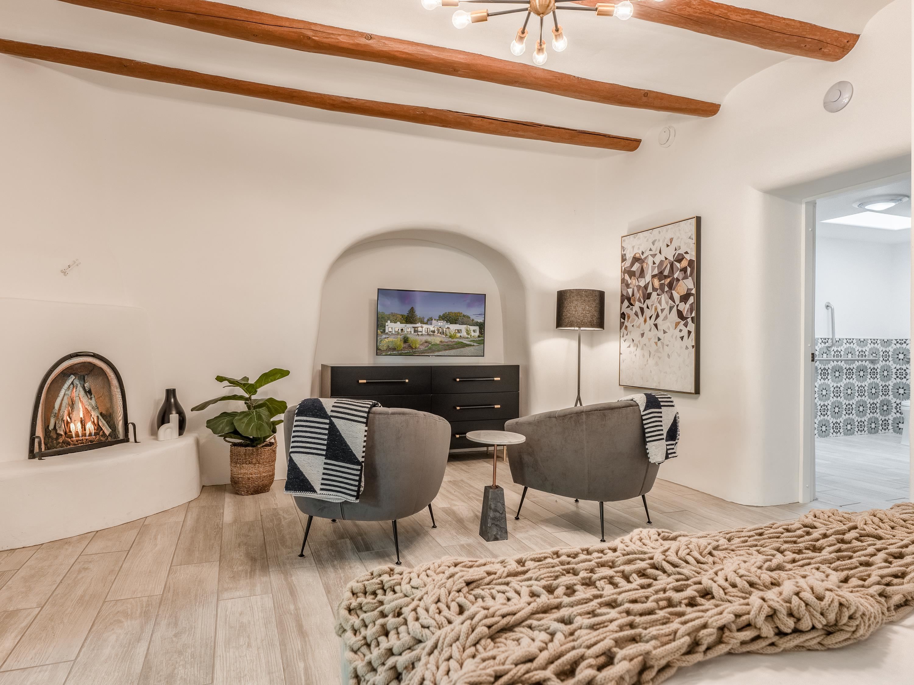 One-of-a-kind luxury property off of Upper Ranchitos Rd in Taos, New Mexico. Located on 7.48 acres and bordered by the Rio Pueblo, 720 Karavas Lane is a beautiful hidden gem within the wide open spaces of Taos. Boasting 9 bedrooms and 9.5 bathrooms, this completely renovated historic adobe home is full of iconic Southwestern details intertwined with thoughtful, modern updates. Saltillo tile and brick floors, large vigas, and adobe-styled fireplaces throughout the home bring warmth to the fresh white plaster walls. Contemporary black accents complement the earth-toned furniture and artwork, which are available for purchase as a complete interior design package. Outdoor accesses, secluded patios and ensuite bathrooms, with custom tiling, ensure ample privacy between the suites. Marvel at the spectacular sunsets through the large windows in the sumptuous great room. The main kitchen is perfect for entertaining thanks to a workhorse back kitchen. The well-stocked bar room with adjacent cocktail lounge ensure everyone’s cup is full. Gather friends and family on the sunny patios and around the firepit in the backyard shaded by mature cottonwoods and apple trees. Impressive landscape architecture, a quintessential horno, bocce ball court, and hot tub complete the outdoor oasis. 720 Karavas Lane, where luxury perfectly intersects cozy.